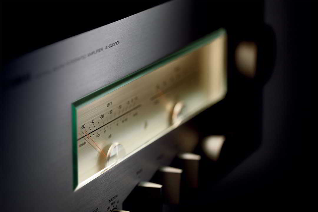 The A-S3000 features large level meters on the front panel, giving a direct visual sense of the dynamics and pulse of the music. These beautiful meters are softly illuminated by LED, lending a warm, lamplight look. The meter indicators can, in addition to the VU display, be switched to peak display, and can be selected according to the user’s preference. Moreover, the glass window of the meters is diagonally cut and precision-fit to the back surface of the front panel, leaving no gaps and using no screws for connection—lending an exceptionally elegant appearance to the unit.