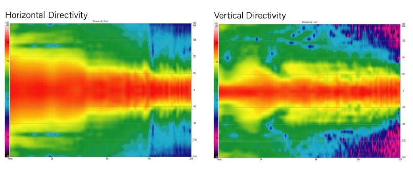 The waveguide also has a major role to play here, as optimal waveguide geometries are not easy to conjure. Perlisten’s waveguide keeps the tweeter’s horizontal dispersion wide and the vertical dispersion narrow at a consistent directivity up to the high-frequency limits of human hearing. It’s the perfect shape for a directivity match with the midrange drivers. The really cool thing about the DPC array is that the three drivers are used to reduce each other’s vertical dispersion and also strengthen the axial response by means of phase summation and cancellation. Separate drivers that play the same frequency will inevitably start interfering with each other at high enough frequencies, and often times this can be a problem, but for Perlisten, it’s a solution to reduce acoustic reflections off of the floor and ceiling. This is a part of what is called beamforming, and it is a similar technique to how 5G transmitters precisely deliver a strong signal to a receiver in a specific direction instead of spraying it inefficiently over a broad angle. Likewise, the woofers flanking the DPC array do the same thing at lower frequencies, so vertical dispersion is restricted by design for all the deepest bass frequencies. While a restricted vertical dispersion can be a desirable feature, a wide horizontal dispersion can also be desirable, and Perlisten’s design looks to encourage a wide dispersion while discouraging vertical dispersion in a very clever approach to directivity control.